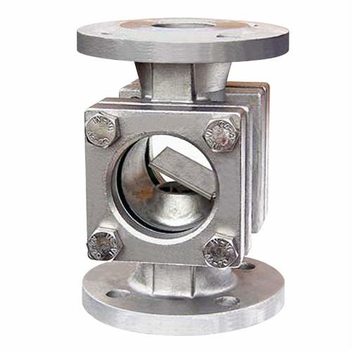 擺板流量視鏡由玻璃視鏡、觀察管道、進(jìn)出水管道,觀察管道分別與進(jìn)水管道和出水管道焊接連通,在觀察管道中有一塊能隨著介質(zhì)自由擺動(dòng)的舌片,舌片與管道垂直自然下垂.在管道中沒有介質(zhì)流動(dòng)的情況下,舌片處于關(guān)閉狀態(tài),當(dāng)管道中有介質(zhì)流動(dòng)后,舌片就會隨著介質(zhì)流動(dòng)的強(qiáng)度,相應(yīng)的轉(zhuǎn)動(dòng)一定的角度,這樣觀察舌片的位置就可以以比較直觀的看到管道內(nèi)的情況了。