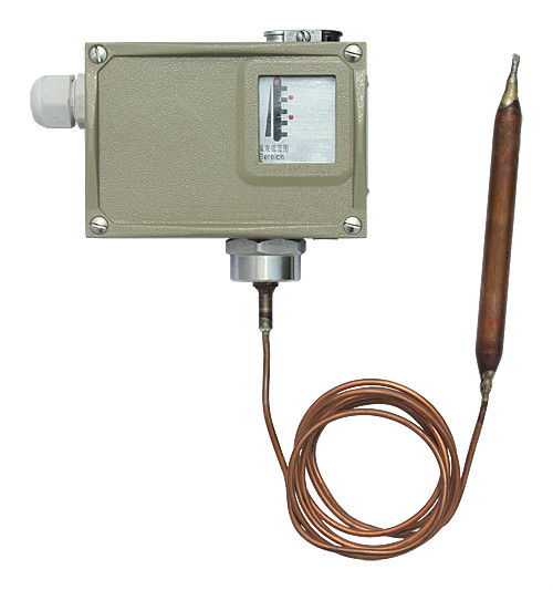 該溫度控制器采用帶毛細(xì)管溫包式傳感器??捎糜诹鲃拥闹行詺怏w和液體介質(zhì),如果介質(zhì)為腐蝕性,安裝時可選用不銹鋼溫包保護(hù)套套在銅質(zhì)溫包外??刂破鞯脑O(shè)定值可調(diào),調(diào)節(jié)范圍﹣30℃~+280℃。