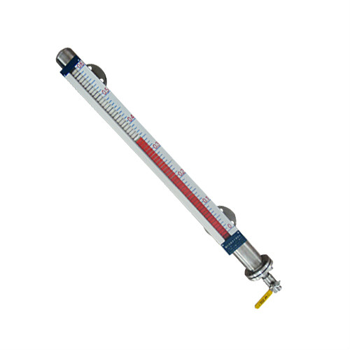 磁翻板液位計(也可稱為磁性浮子液位計)根據(jù)浮力原理和磁性耦合作用研制而成。在與容器連接的連通管內(nèi),浮筒隨管內(nèi)的液面上升、下降從而反映容器的液位變化,然后通過浮簡內(nèi)的磁鋼,將液位的變化傳輸?shù)郊t、白指示反光柱上。液位上升時,紅半螢光柱連續(xù)翻向外面,液位下降時,白半反光柱連續(xù)翻向外面。根據(jù)紅半反光柱指示的液位高度讀出具體數(shù)值。